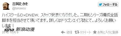 三人在杂志上进行了简短的留言,同时吉冈孝夫还在推特上表示,自己不光将担任系列构成,还将像动画第一期那样,担任二期全话的脚本创作。一般的动画作品都是由复数的脚本家分工合作,再由系列构成进行话数分配和穿针引线,单人承担一整部动画全部剧情的例子,虽然不罕见但也绝非常态,体现了吉冈孝夫的高效率和对本作的高度热情。