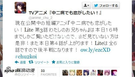 京ANI出品的10月新番《中二病也要恋爱》目前已放送至第4话,而《中二病也要恋爱》Lite版则是每周动画正式播出之前,在网络上放出的6分钟左右卖萌精简版,虽然往往高潮剧情大都不会出现在精简版中,但因为有只有精简版才能看到的特别版OP/ED以及本作本身的大人气,Lite版仍然有着不俗的点击率。
