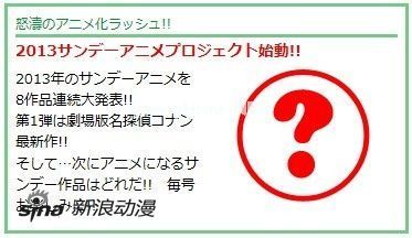 此前曾报道,日本三大少年漫画杂志之一的《少年SUNDAY》在最新号中宣布将在接下来的8期中连续公开8部作品的动画化企划,让人看到了这本销量每况愈下的老牌漫画杂志的全力反击。现在根据《少年SUNDAY》官网下期预告,8作品连续发表的第一弹已经确认将为《名侦探柯南》的新作剧场版,详细内容将在下期的《少年SUNDAY》中正式揭晓。