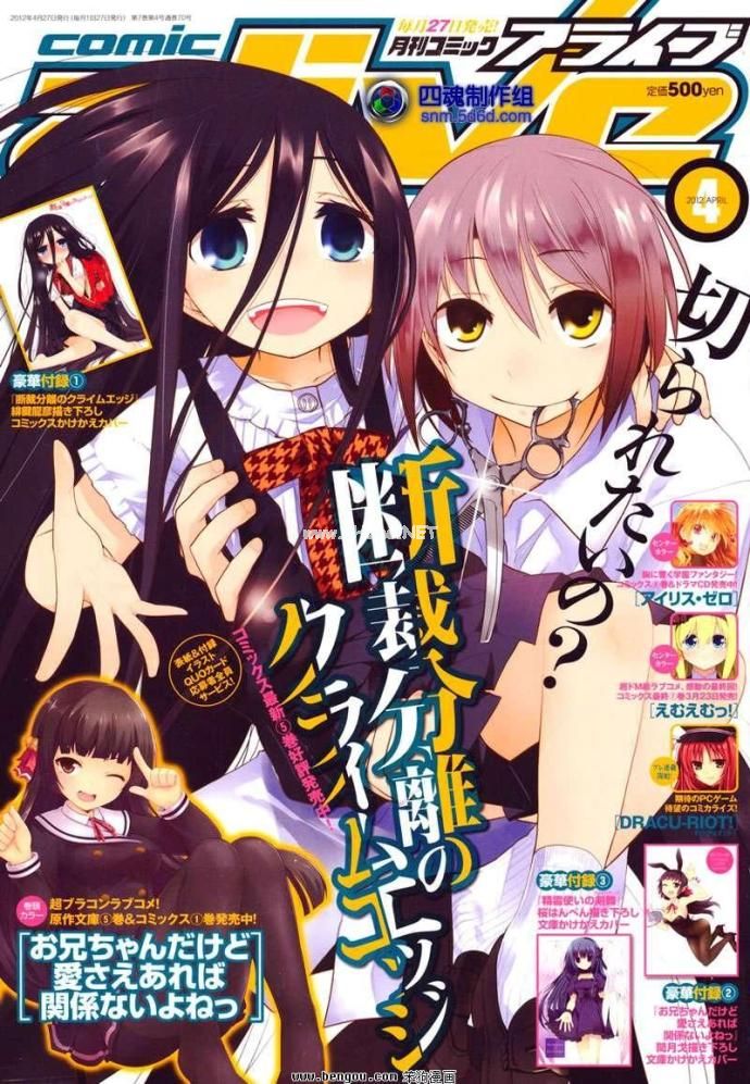 本站曾于上个月报道了日本漫画家绯键龙彦老师在「月刊Comic Alive」上连载的漫画「裁断分离之罪恶剪刀」将在本月底发售的「月刊Comic Alive」2013年1月号上有超重大发表的消息。今日,在本作再版重印的漫画单行本第1卷的书腰上,赫然发现了本作决定TV动画化、并将于明年春季开始播放的消息。如果不出意外,这就是上月所说的“超重大发表”了。