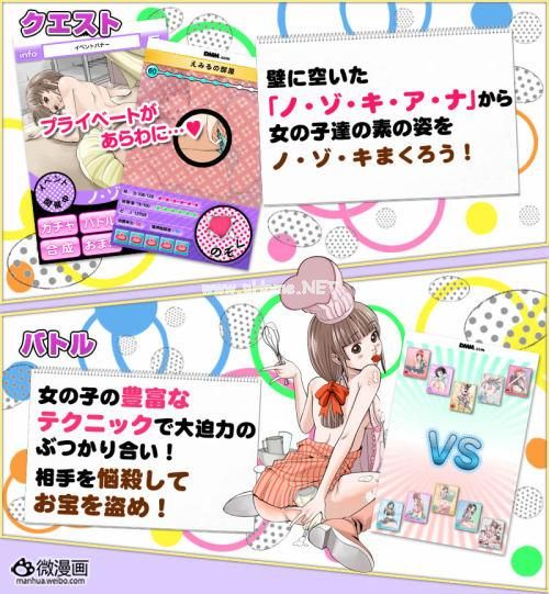 由DMM手机游戏平台的《孔中窥见真理之貌》手机游戏将于2月下旬上线。游戏内容包含通过“小洞”偷窥女性角色、卡片对战、卡片的收集与合成等要素,所有卡片均由原作者本名和光精心描绘,杀必死满载。